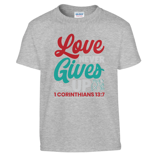 Love Never Gives Up - 1 Corinthians 13:7 - Youth T-Shirt